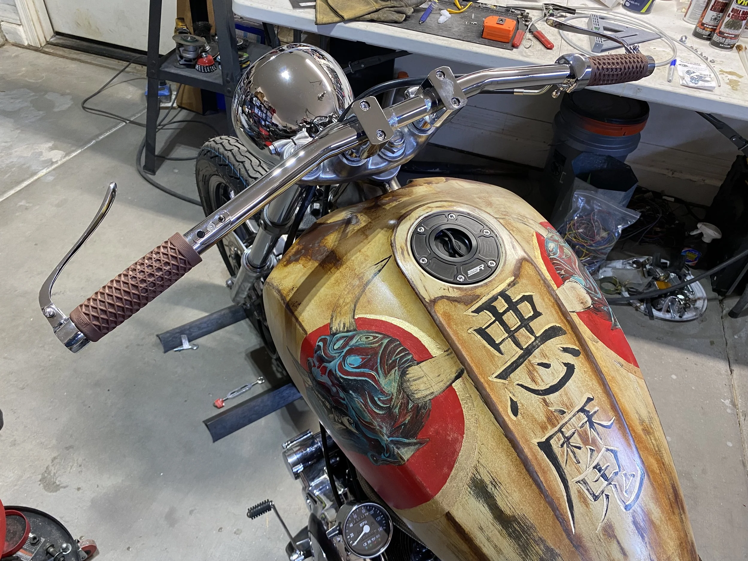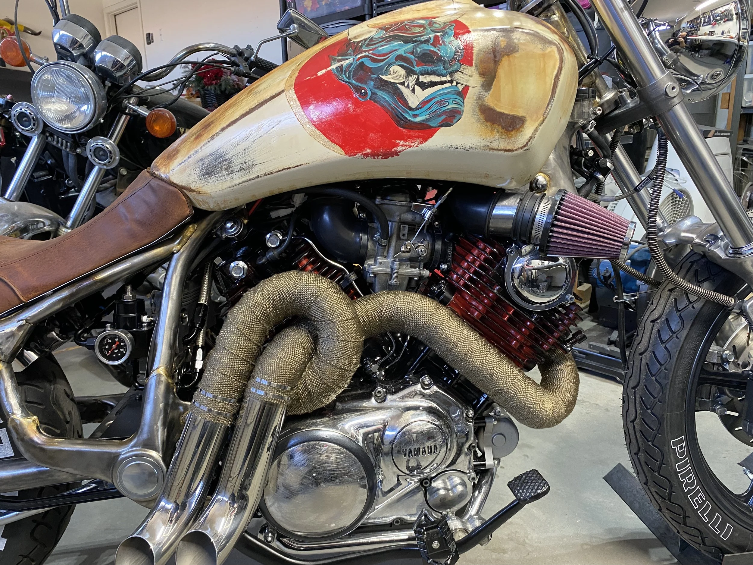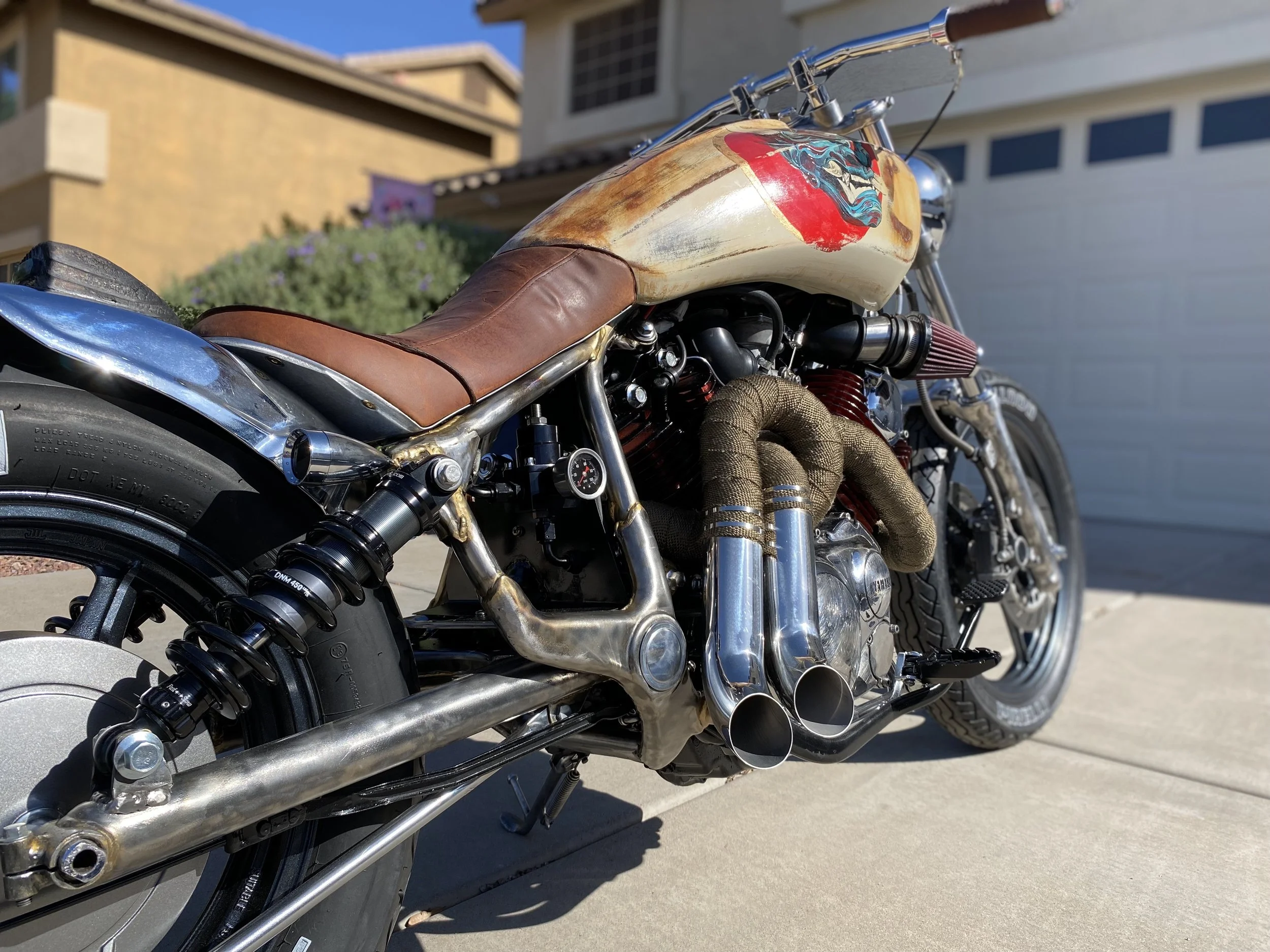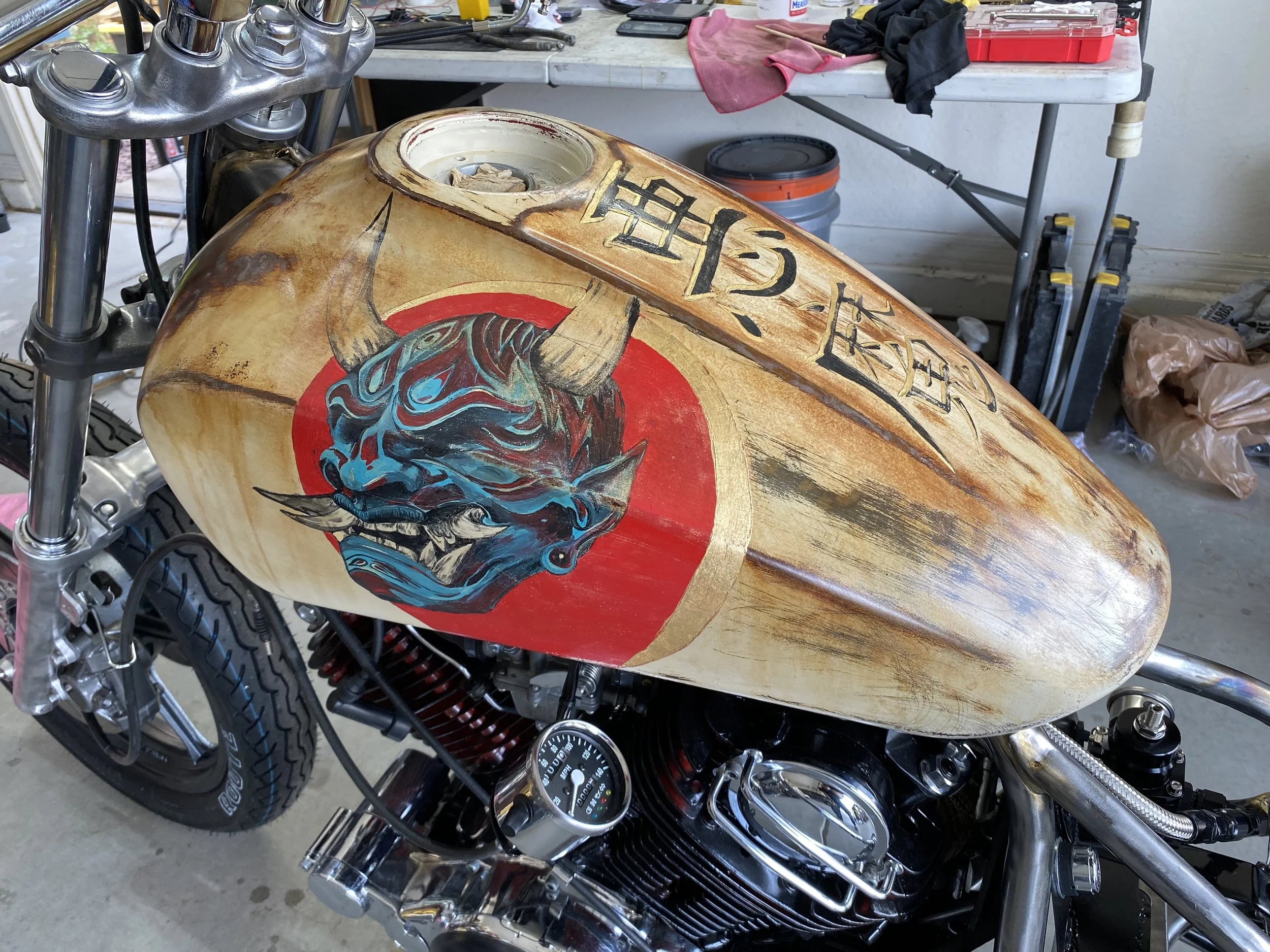 The tank was stripped to bare metal, and plates were added to the front to reshape the tunnel to fit the frame of the XV better. Tank mounts were made on the frame to fit the mounts on the tank. The tank was then hand-painted with blue and red on a neutral background. It was scuffed and rusted to create the distressed patina, then coated with clear to seal it all in. A fuel regulator keeps the fuel pump pressure low enough to run a set of CV carbs.