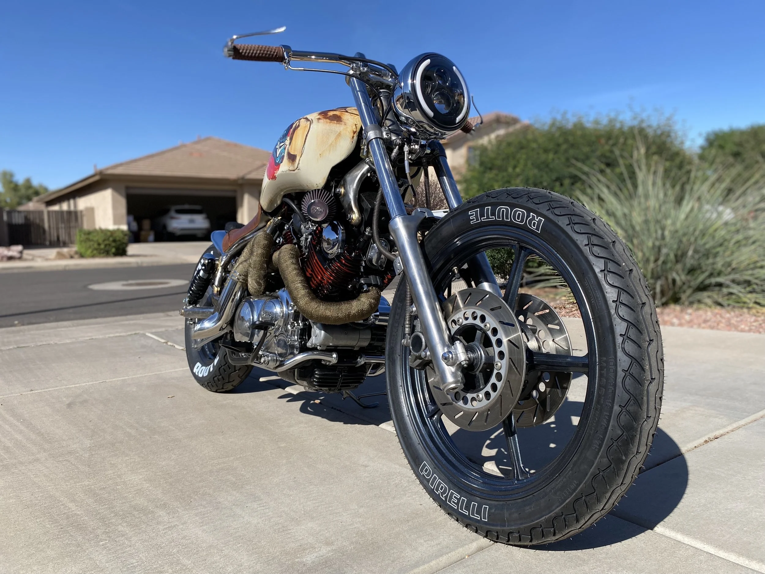 This Gen 2 XV had a rough beginning. When I acquired it, it was a non-runner with a bad rotor and stater. There were lots of missing parts and a parts box full of XV parts from a Gen 1 model. There was little direction or inspiration to get this build off the ground. The first goal was to get it running and fix its issues with the charging system. After sitting for quite some time in the garage and staring at it for months, the bike wanted to be a bobber. The previous owner had already cut the tail end, and something had to be done with it. The gas tank was purchased to complement the engine and give the bike a new line. The tank is from a 2016 Indian Scout with fuel injection and a gas pump built into the tank.