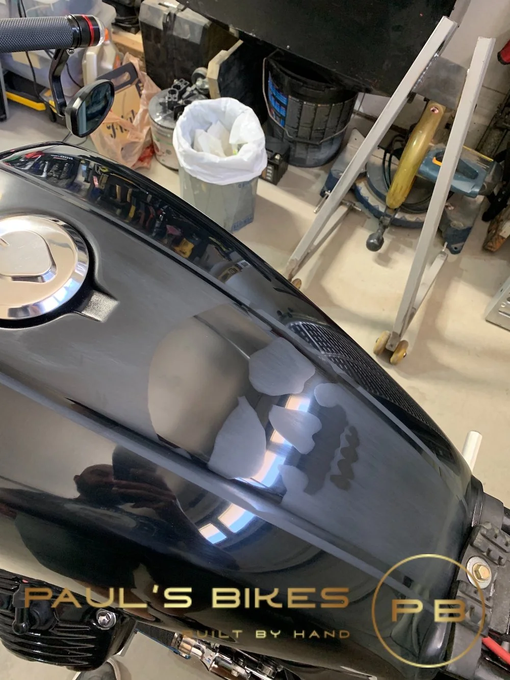 The frame was cleaned up to knock off the ugly seam welds, and the side panel mounting holes were all removed. The rear sub-frame was re-imagined with simple lines and an upswept tail. The tank position was modified to be more aggressive by moving it back and lowering the front. The paint features a subtle skull hidden in the matt stripe going down the center of the tank that disappears in certain light.
