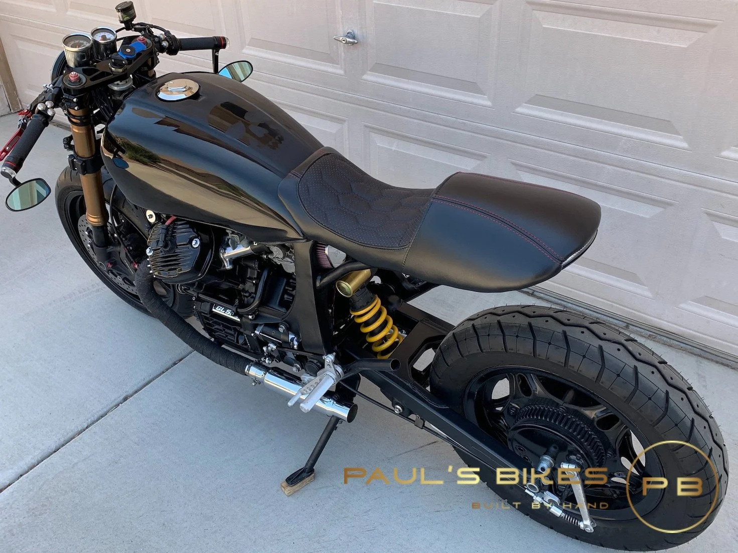 With a set of Yamaha GSX-R 1000 front forks and a Honda CBR954 RR rear mono shock, the handling of this machine got a huge upgrade from stock, and the bike was given a more aggressive stance. I was sure to pay close attention to the geometry so it would handle like a modern sports bike. Complementing the stance with the seating position, new rear sets were custom-fitted to the GL frame to push the rider back in the seat, making the riding position more comfortable.